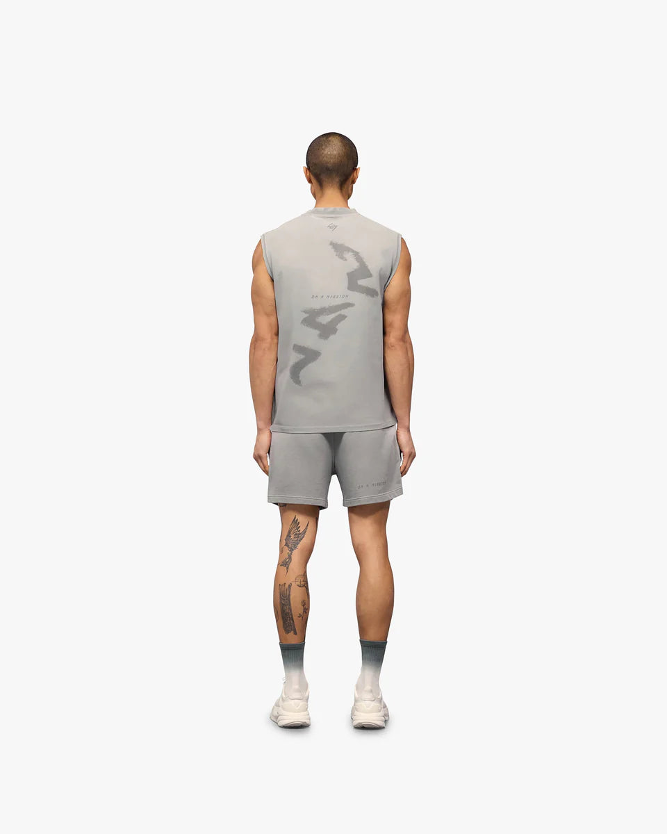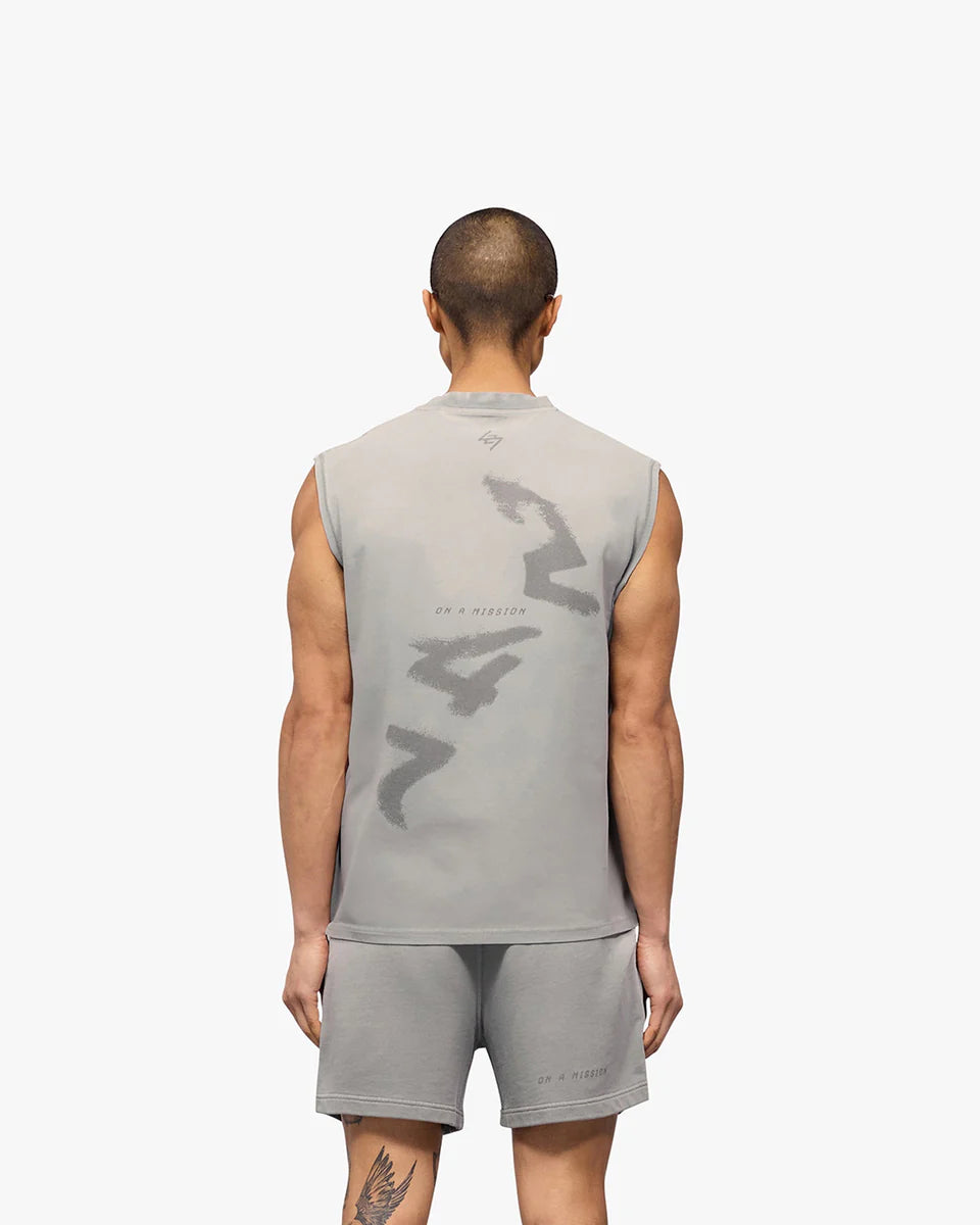 The oversized fit provides easy wearability, finished with a water based graphic print to the front and back. The tank has a fade out wash with spray applied for a vintage aesthetic.